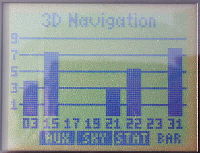Dieses Bild zeigt den Sattelitenstatus des Garmin an. Die Titelzeile nennt den Betriebsmodus (3D Navigation, 2D Navigation, Simulation, Satellitensuche). Die Balken geben die Signalqualität der Satelliten an, deren Nummern jeweils unter den Balken stehen. Die drei Felder am unteren Bildschirmrand geben weitere mögliche Darstellungsarten an: AUX führt zur Gerätekonfiguration, wo Datenübertragung, Trackaufzeichnung, etc. eingestellt werden. SKY zeigt eine Himmelskarte mit den Positionen der einzelnen Satelliten und den DOP-Wert (Dilution of Precicision) an. STAT ist eine Textdarstellung des Satellitenstatus. |